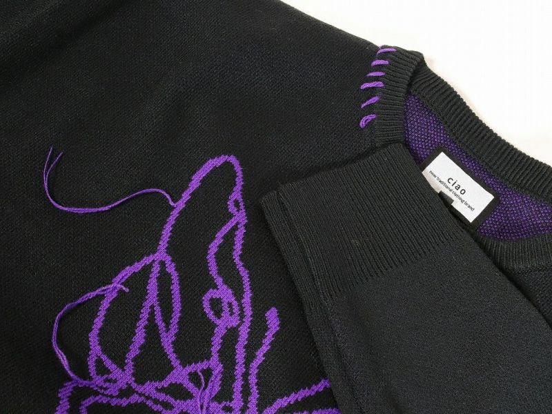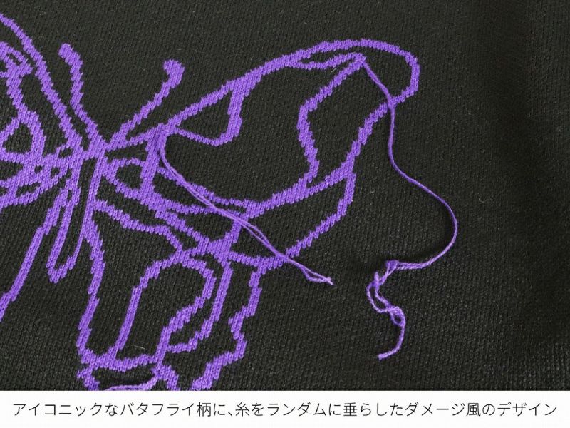 ほつれた蝶がデザインされたダメージ風ニット。ところどころ縫いかけデザインがサブカル・地雷感満載。 しっかりとした生地感で肌触りもよく、秋~冬まで着られます。