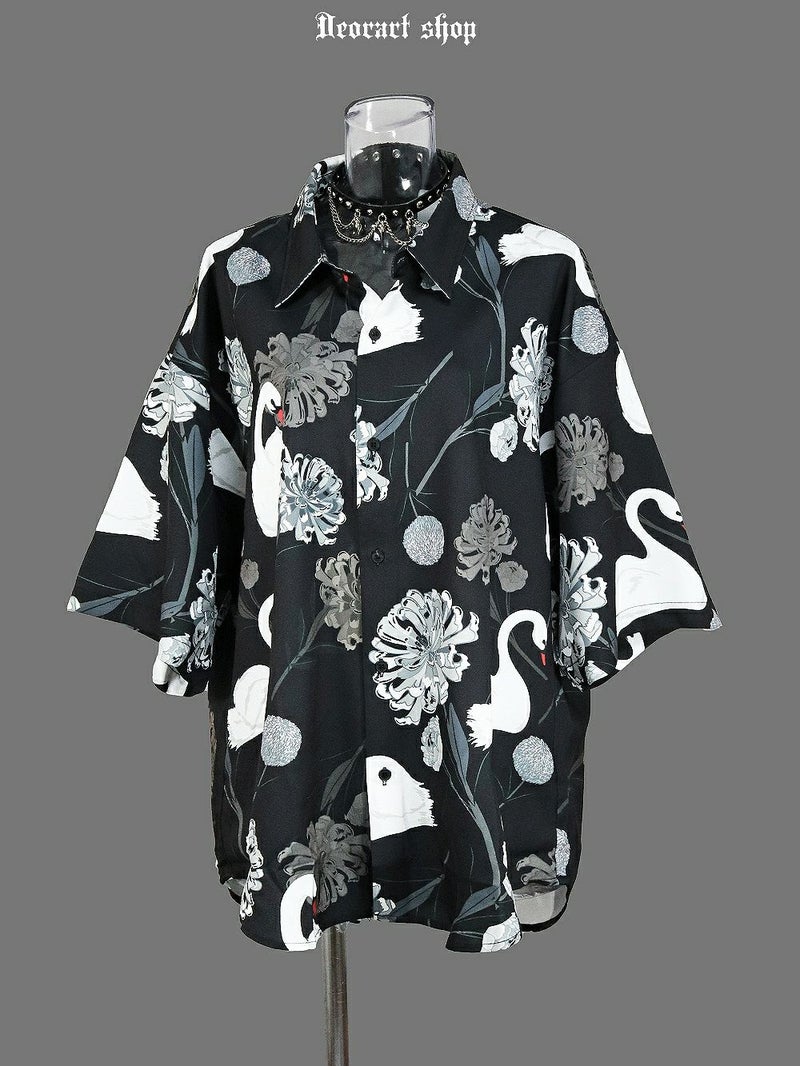 BY7100 [五分袖]ルーズシルエット・ダークカラー スワン柄 総柄 シャツ[swan] (セレクト・アイテム)
