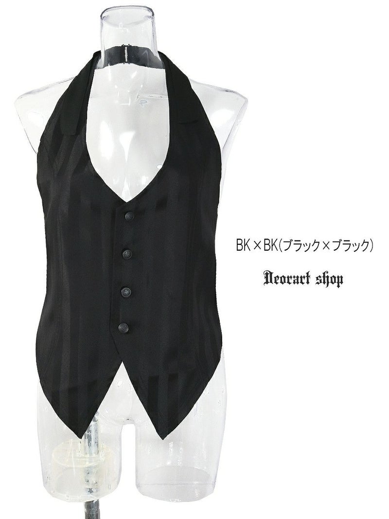 クラシカルなシルエットのホルターネック ベスト・ジレ。 シックなカラーのストライプ柄で ゴシック&高級感のある雰囲気に仕上げたベスト・ジレアイテム。 イベントシーンでも存在感抜群なこだわりのシルエット。 ゴシックスタイルの定番、シャツ&ベストコーデを ひと味差のつく大人な雰囲気にブラッシュアップ。 別売りの同ストライプ柄 バルーンショートパンツ・フラップベルトとのセットスタイルもオススメです。