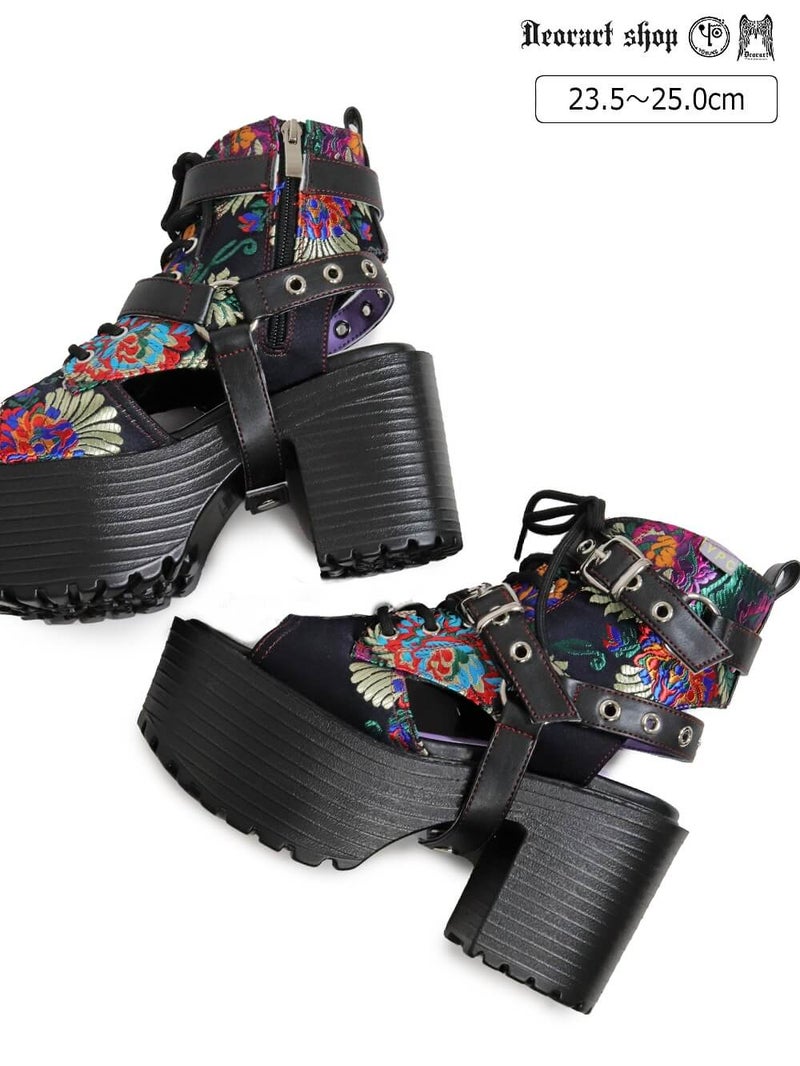 ベルトデザイン×厚底のシルエットが人気のブーツサンダル。 和装ミックスやモードなコーディネートのポイントとして取り入れたい、オリエンタル柄の刺繍デザイン。 下部のハーネスベルトとチェーンは取り外しが可能で、その日の気分やコーディネートに合わせてカスタムしていただけます。