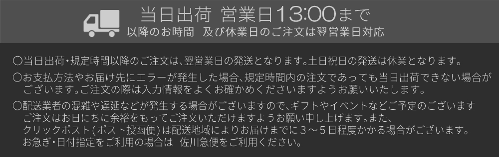 - 上記時間以降のご注文・休業日(土日祝)のご注文は、全て翌営業日より順次発送とさせていただきます。